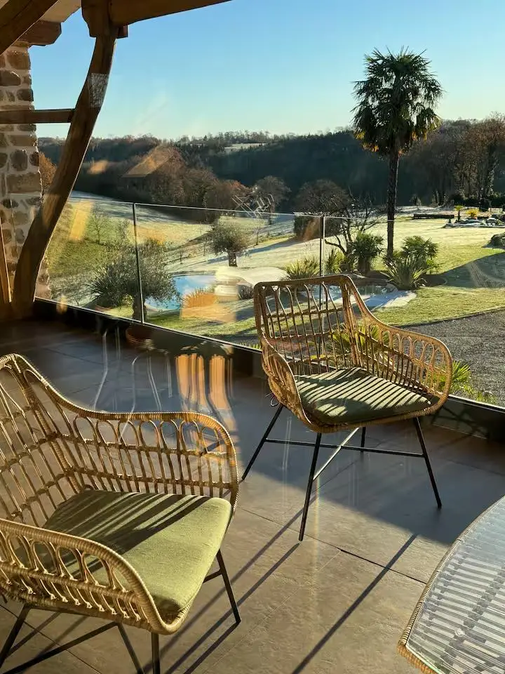 Le salon s'ouvre sur une terrasse couverte de 20 m², véritable coin détente surplombant le domaine.