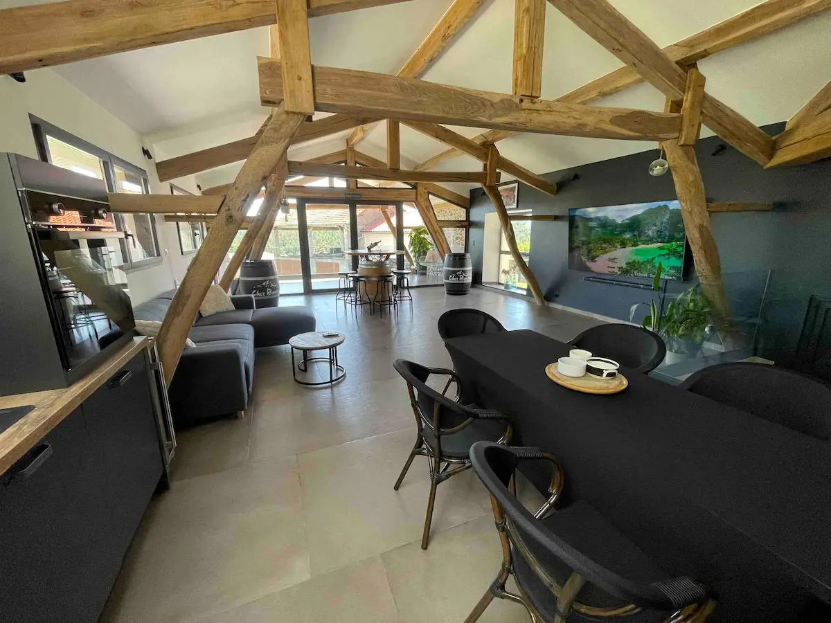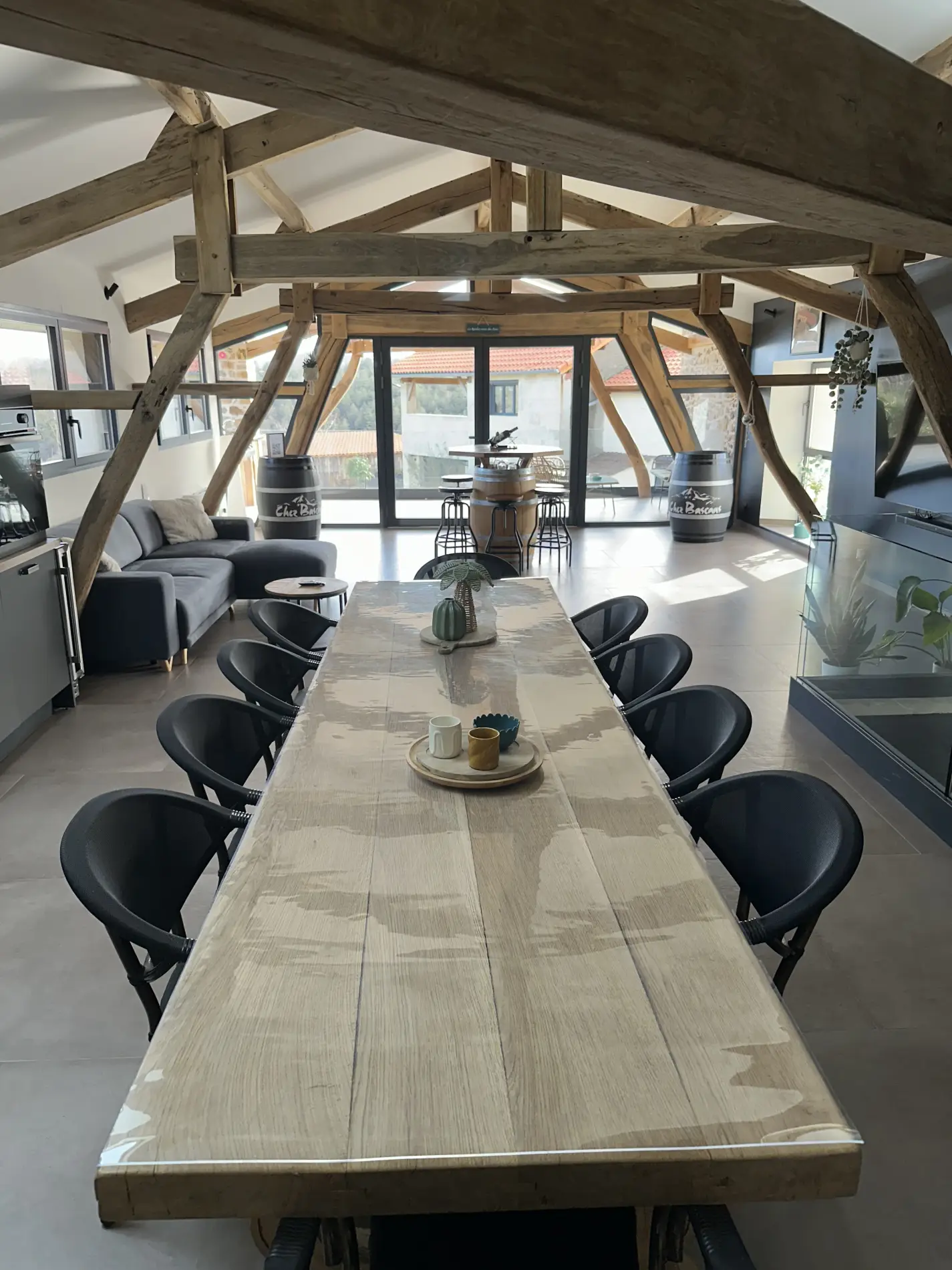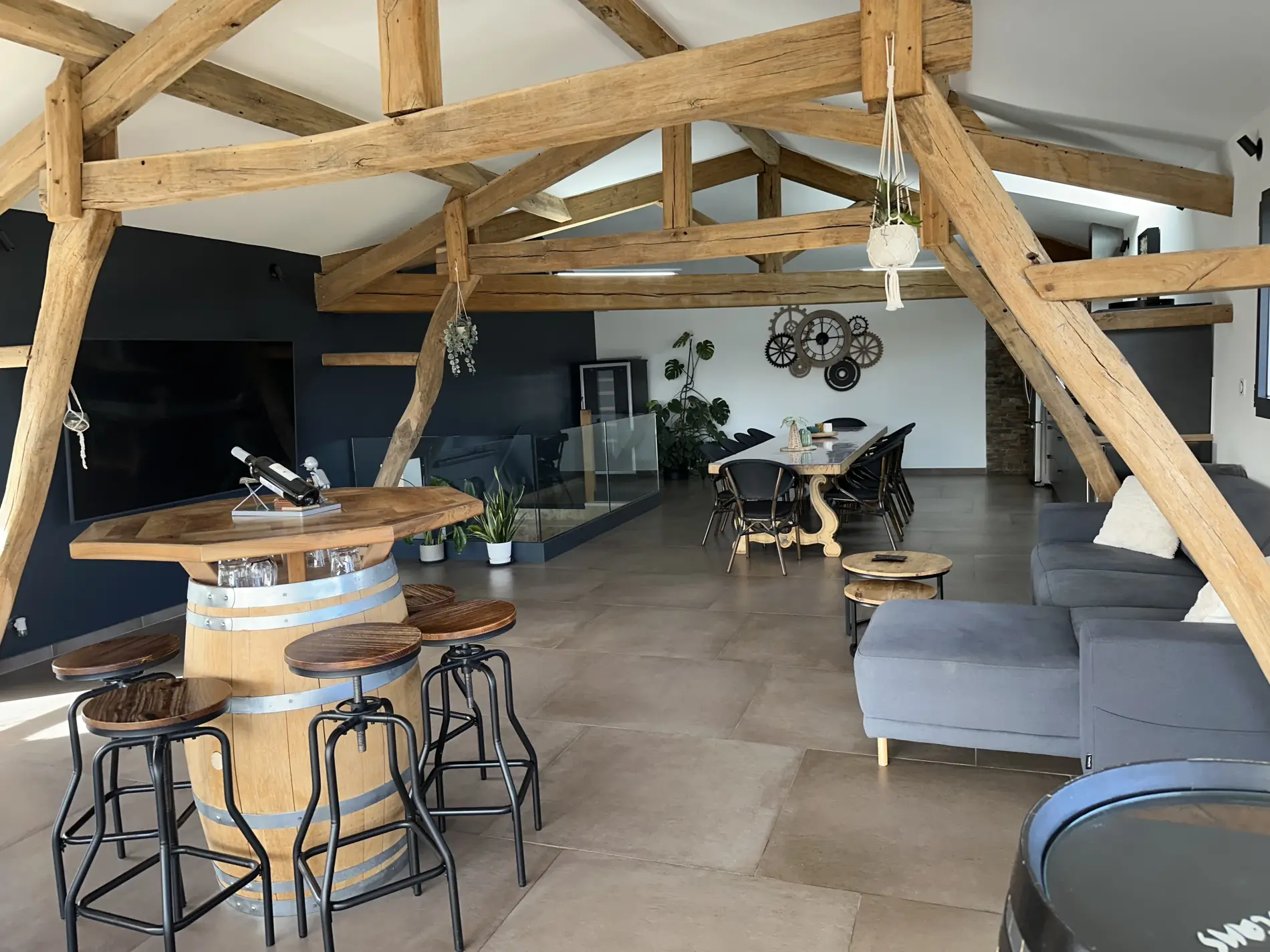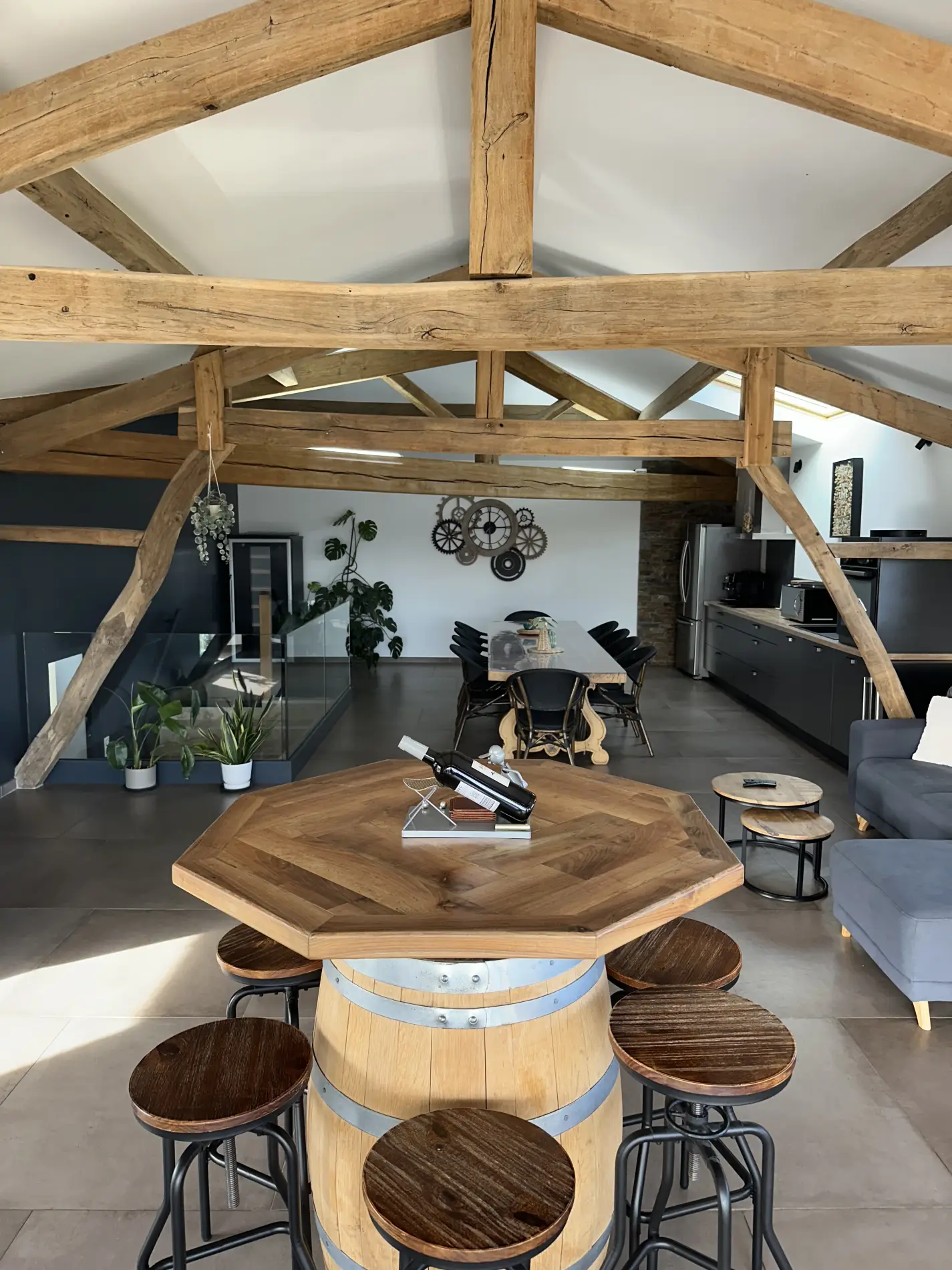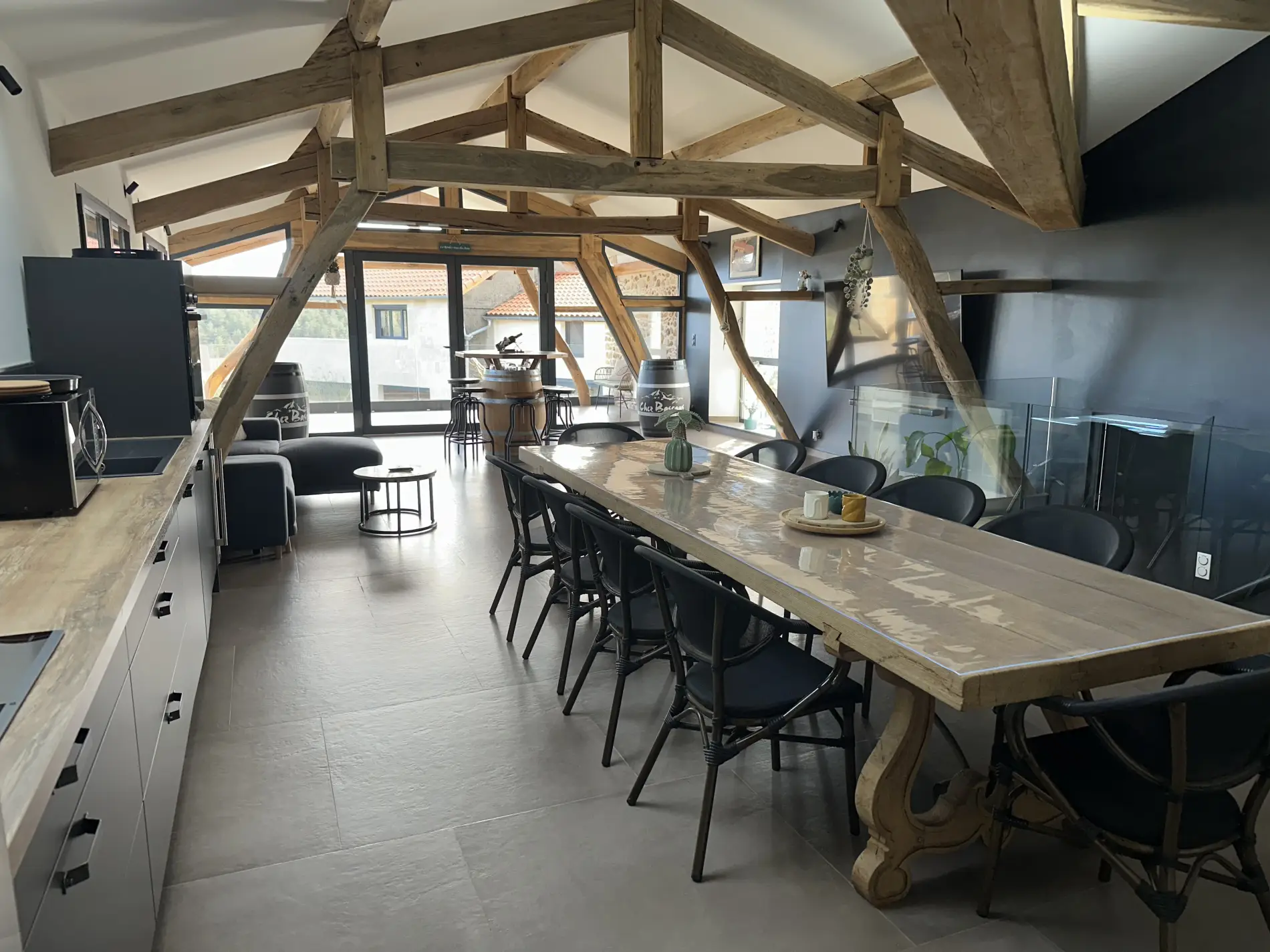 Le cœur de la maison s'organise autour d'un vaste loft de 75 m² situé à l'étage. Accessible par un majestueux escalier en pierre, cet espace de vie baigné de lumière comprend un grand séjour ainsi qu'une cuisine entièrement équipée pour vos moments de convivialité.