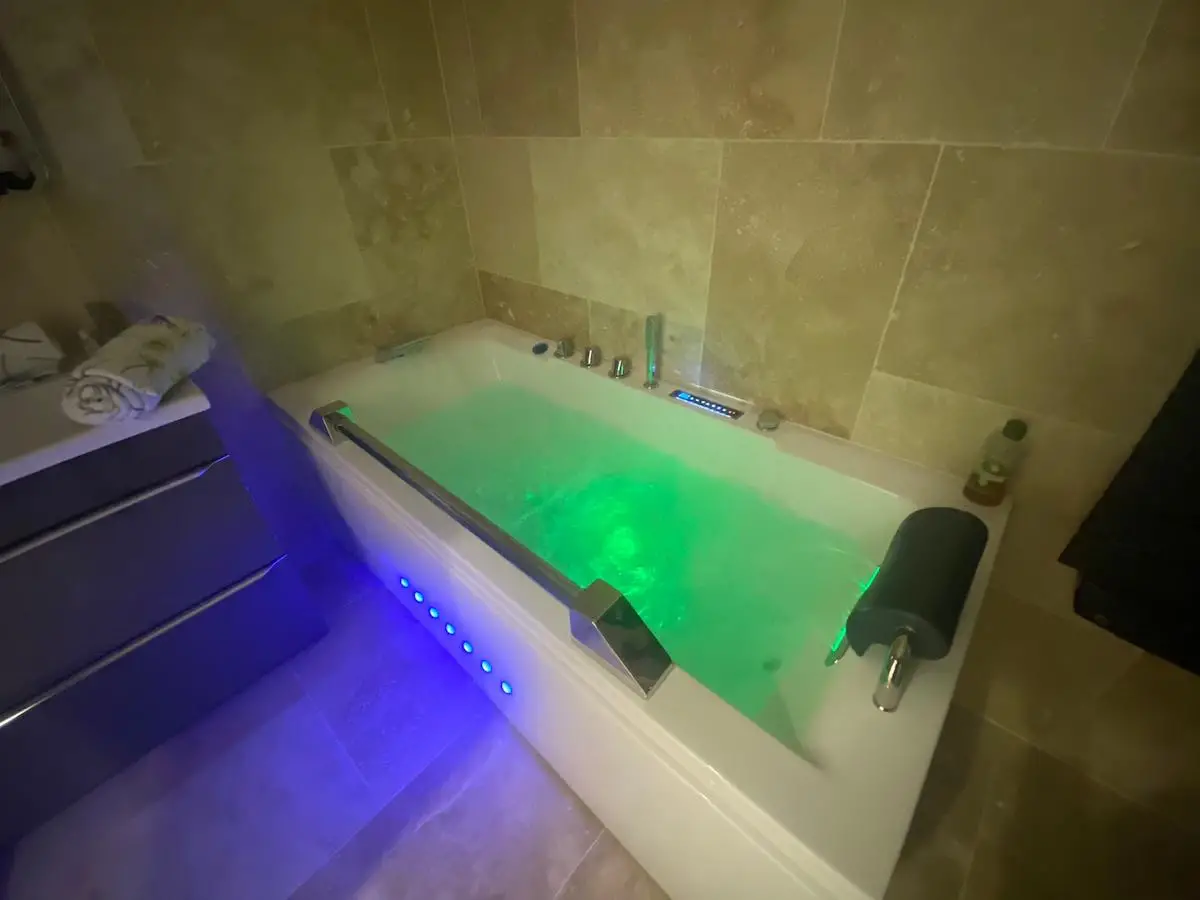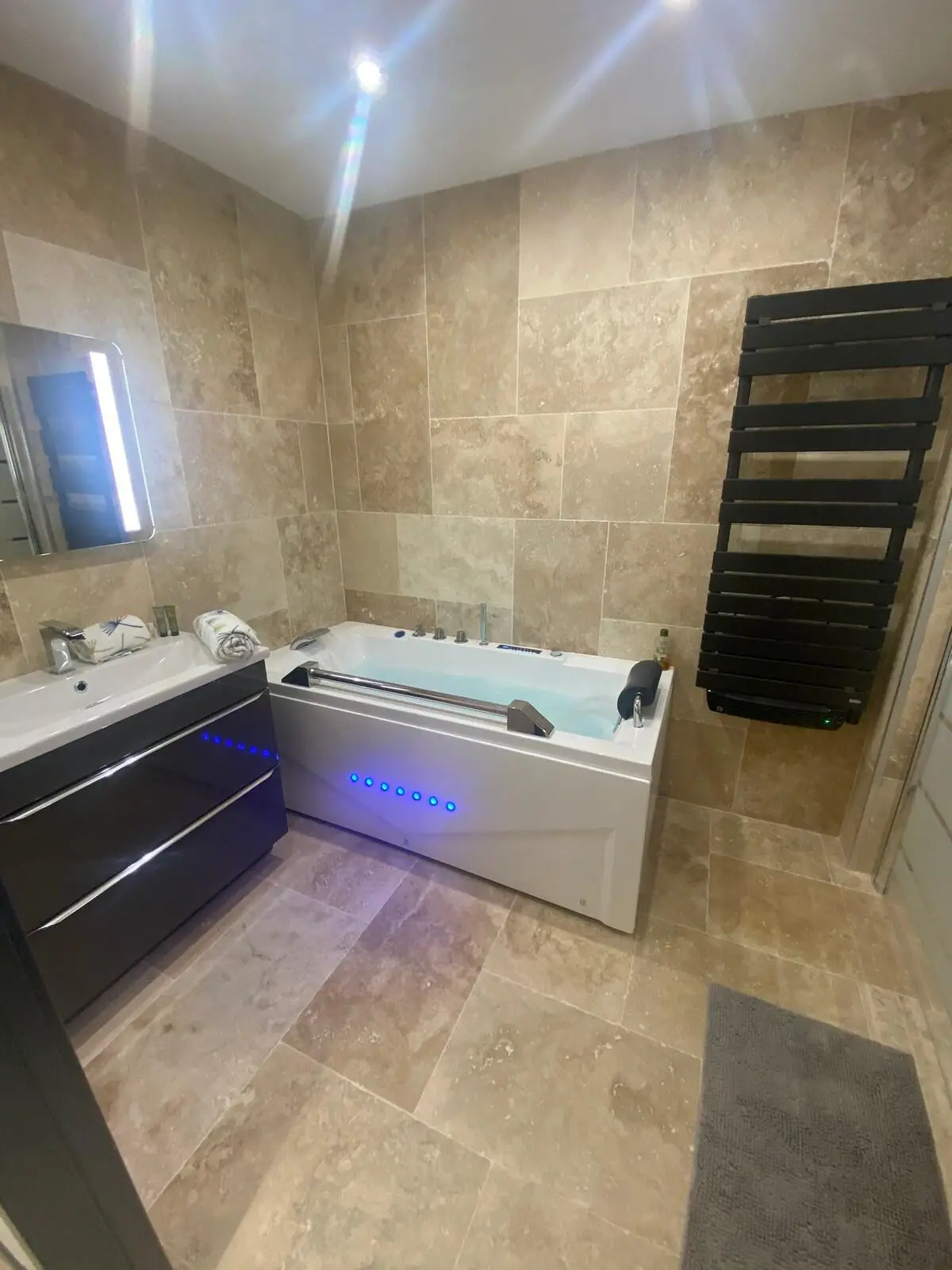 La salle de bain principale se présente comme un véritable temple dédié à la relaxation, alliant fonctionnalité et luxe avec sa douche à l'italienne aux finitions soignées et sa baignoire balnéo aux multiples jets massants, promettant des instants de pure sérénité.