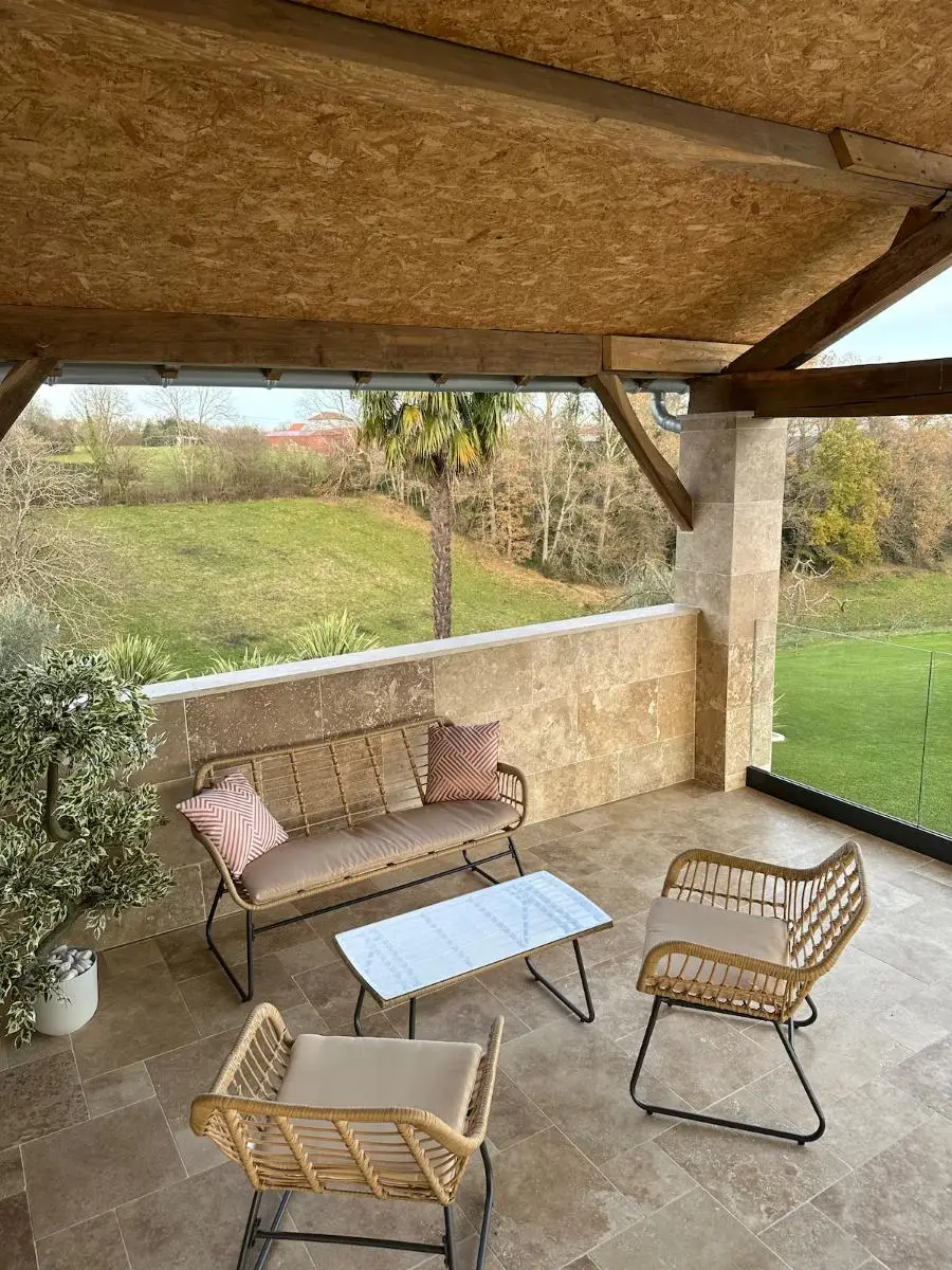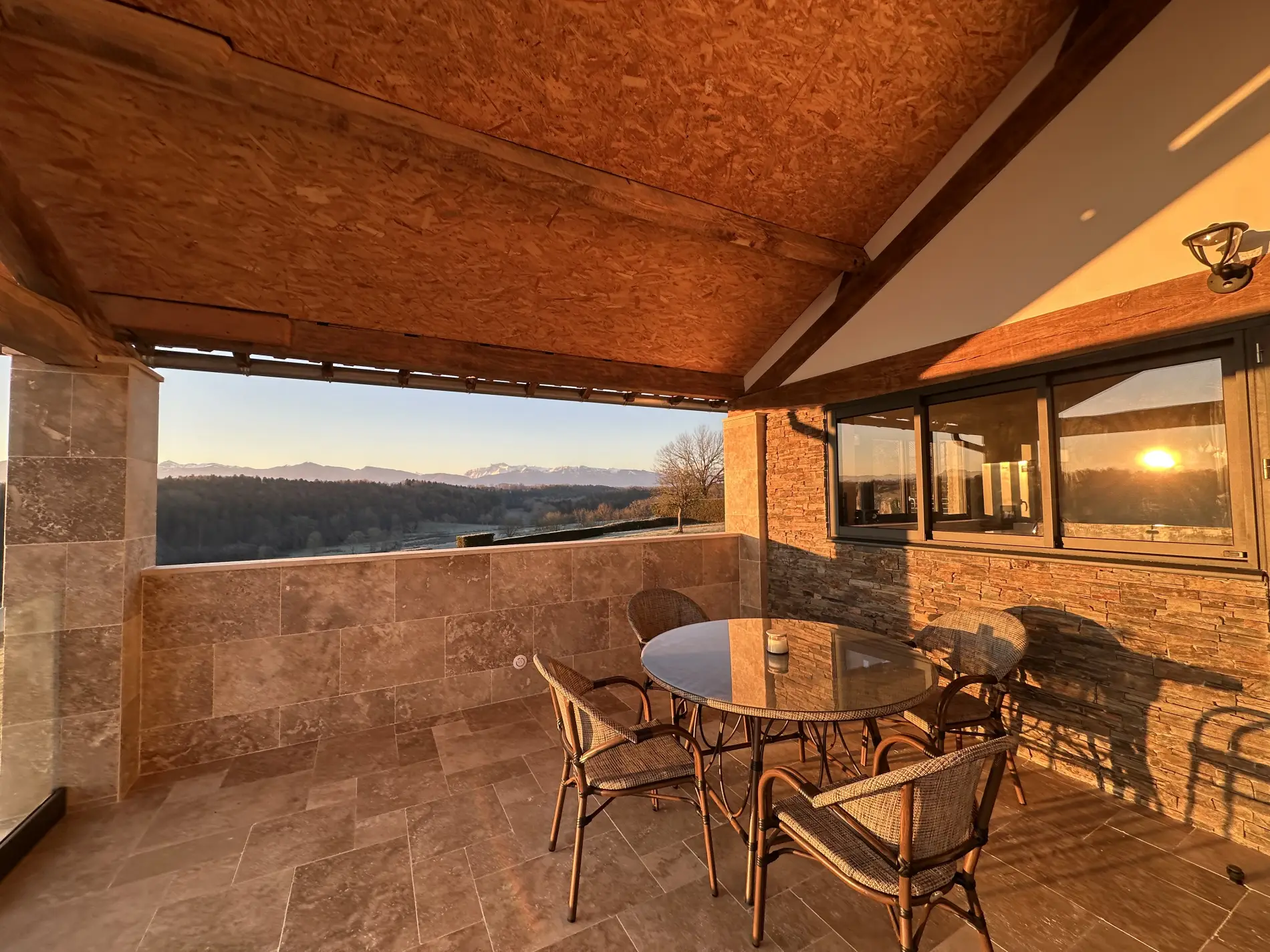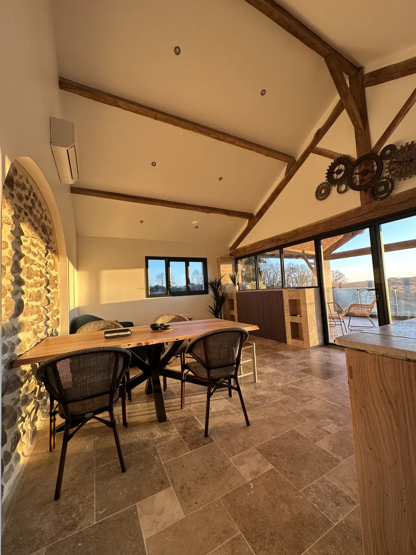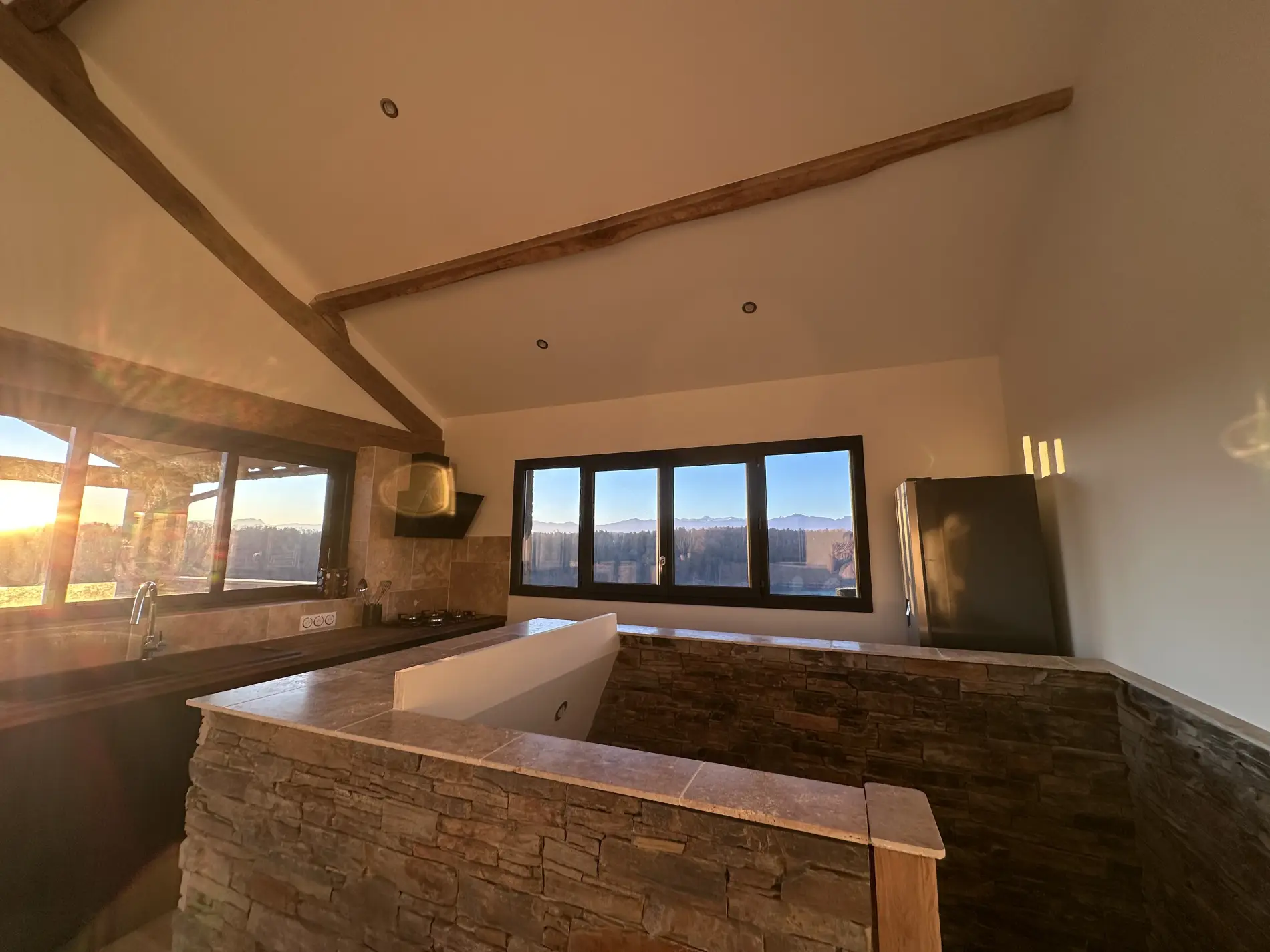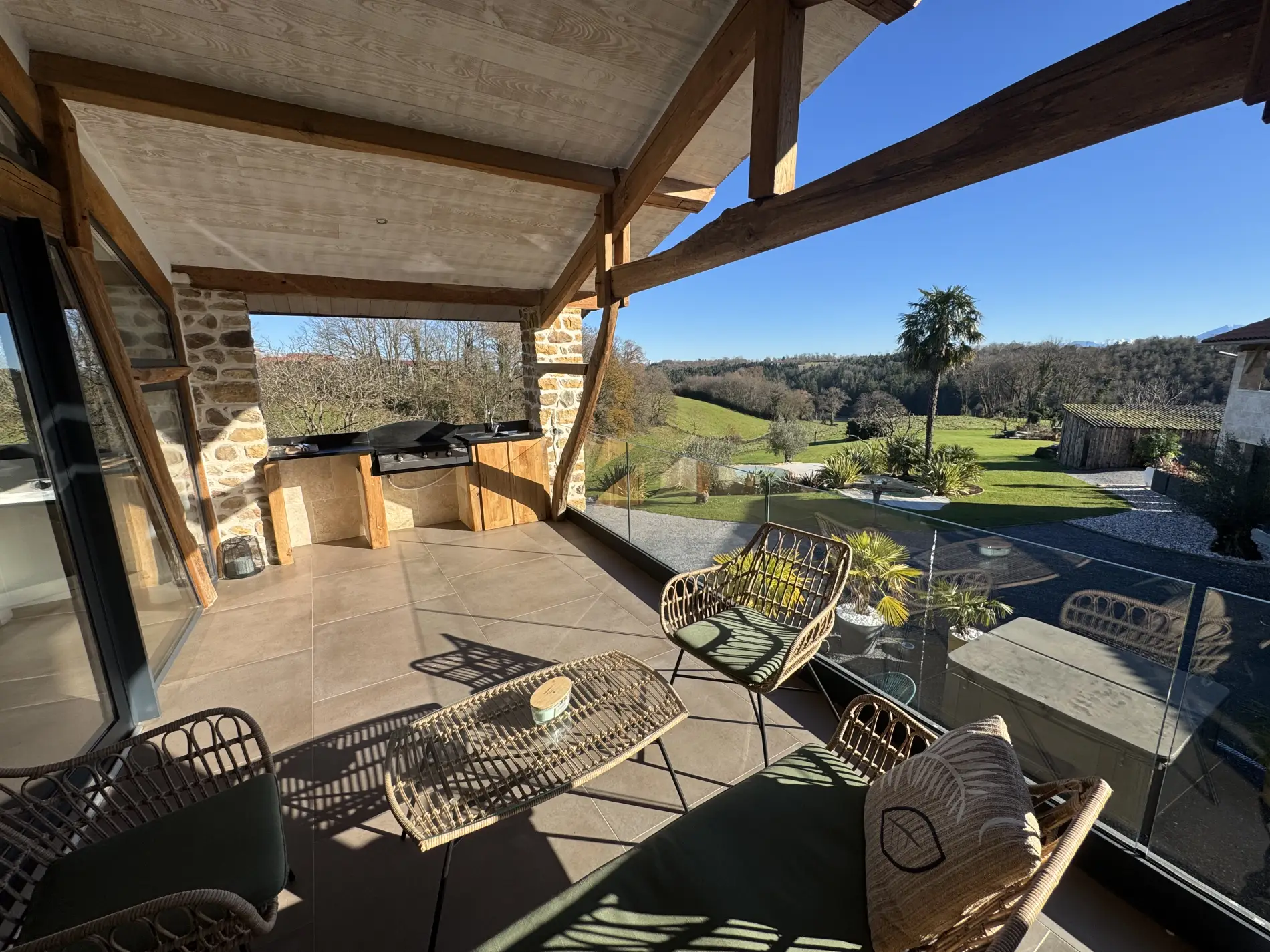 Cet espace convivial s'étend harmonieusement vers l'extérieur grâce à une grande terrasse couverte, véritable belvédère sur les Pyrénées. Ce lieu privilégié vous permettra de savourer vos petits-déjeuners dans la fraîcheur matinale ou de partager un verre entre amis en admirant les teintes flamboyantes du coucher de soleil sur les sommets pyrénéens.