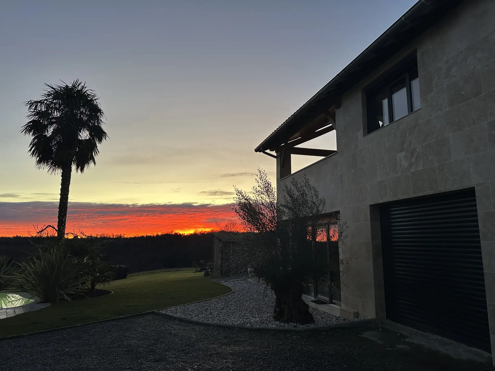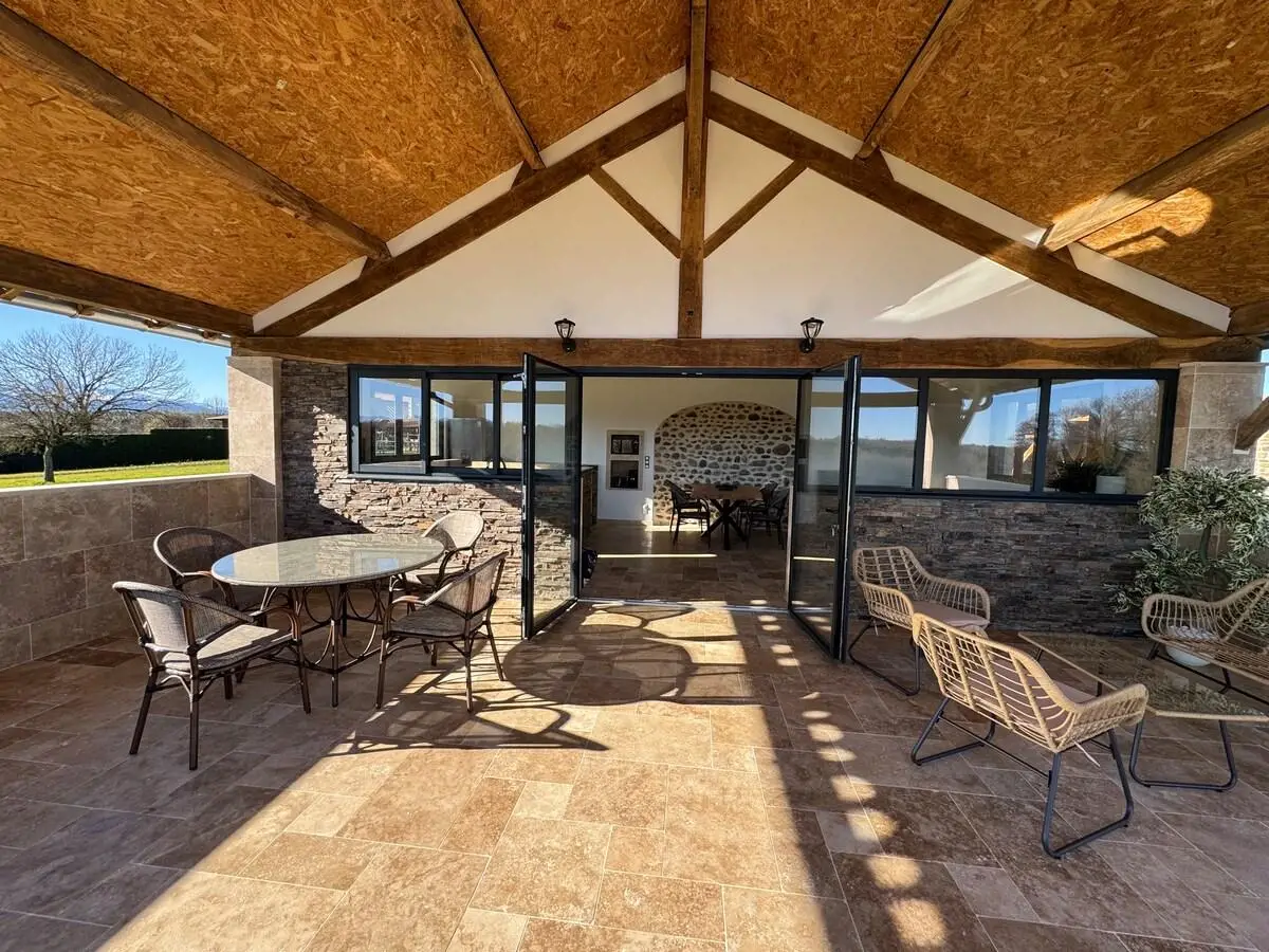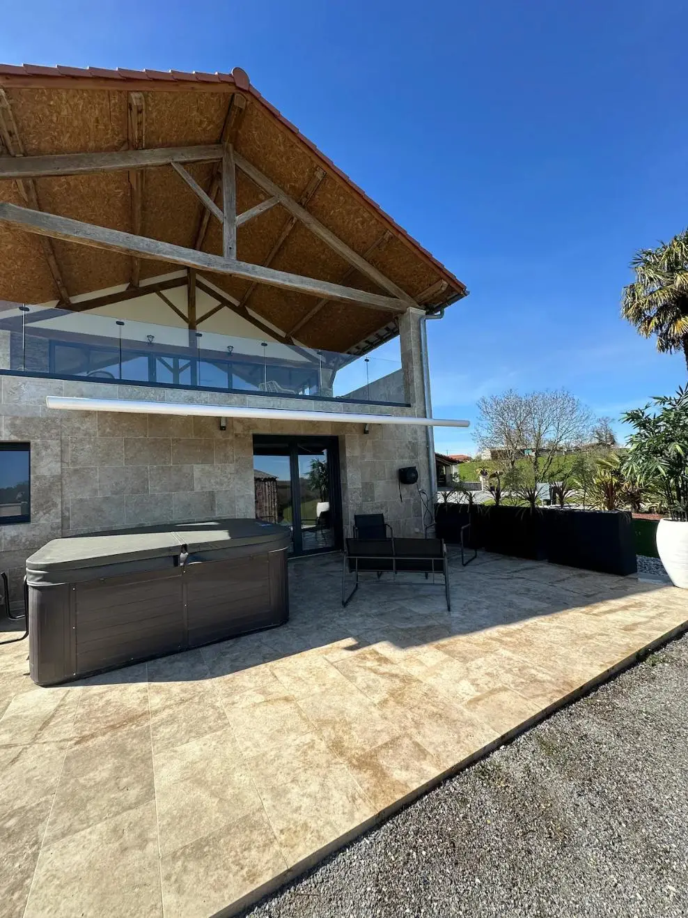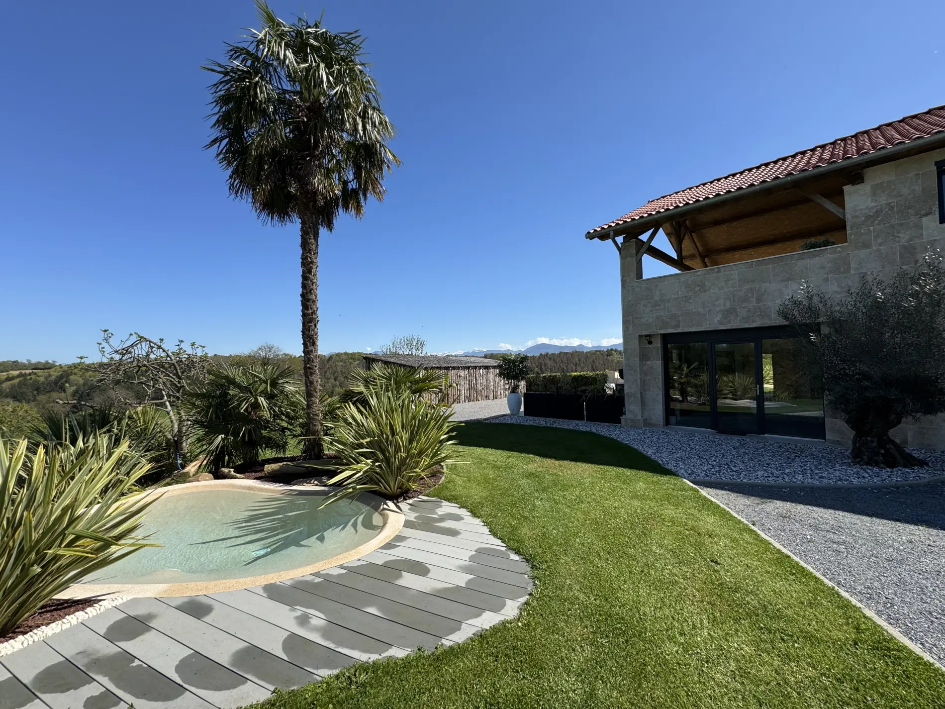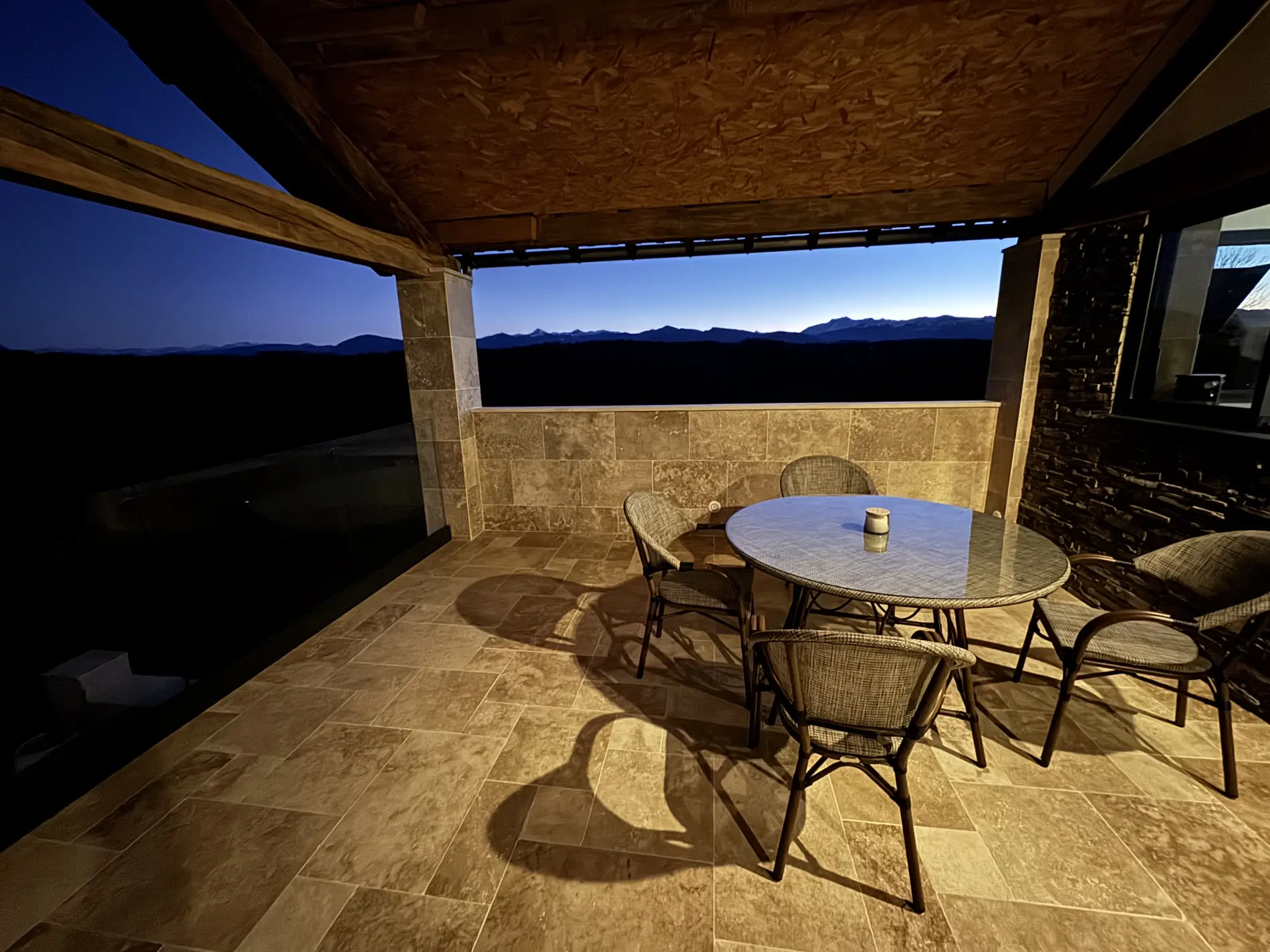 Cet espace convivial s'étend harmonieusement vers l'extérieur grâce à une grande terrasse couverte, véritable belvédère sur les Pyrénées. Ce lieu privilégié vous permettra de savourer vos petits-déjeuners dans la fraîcheur matinale ou de partager un verre entre amis en admirant les teintes flamboyantes du coucher de soleil sur les sommets pyrénéens.