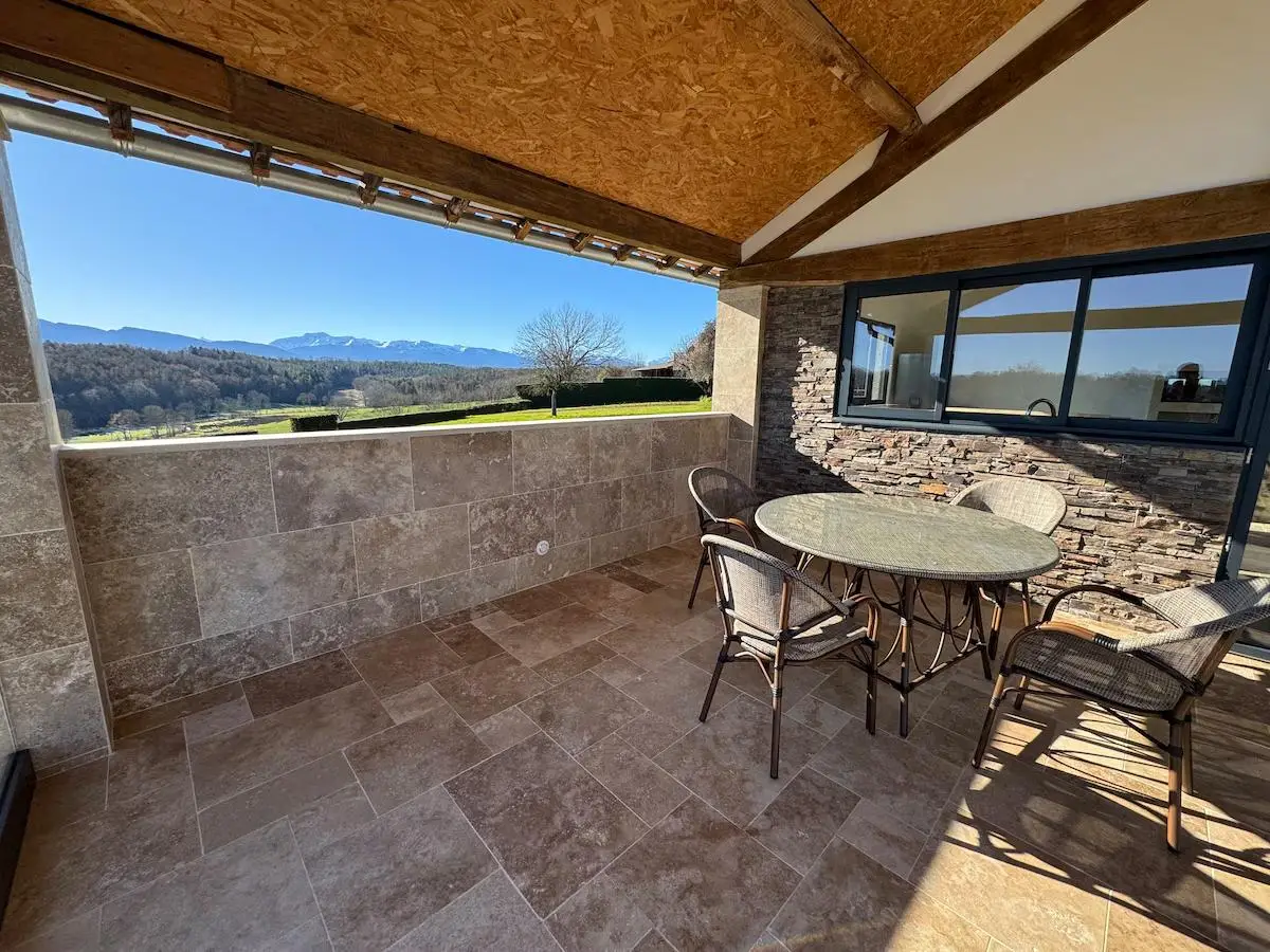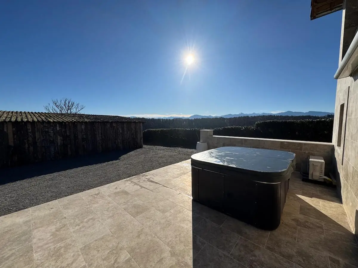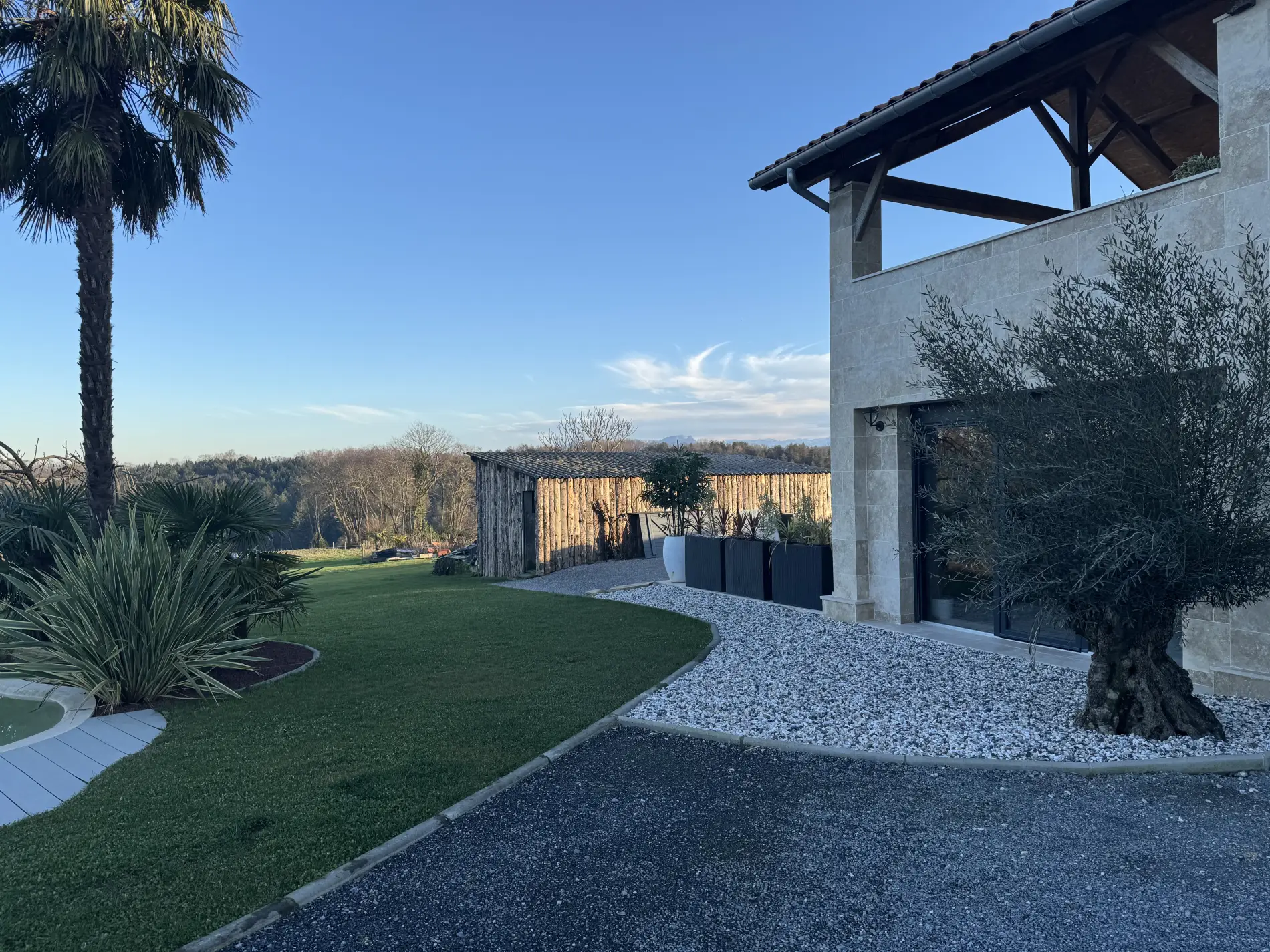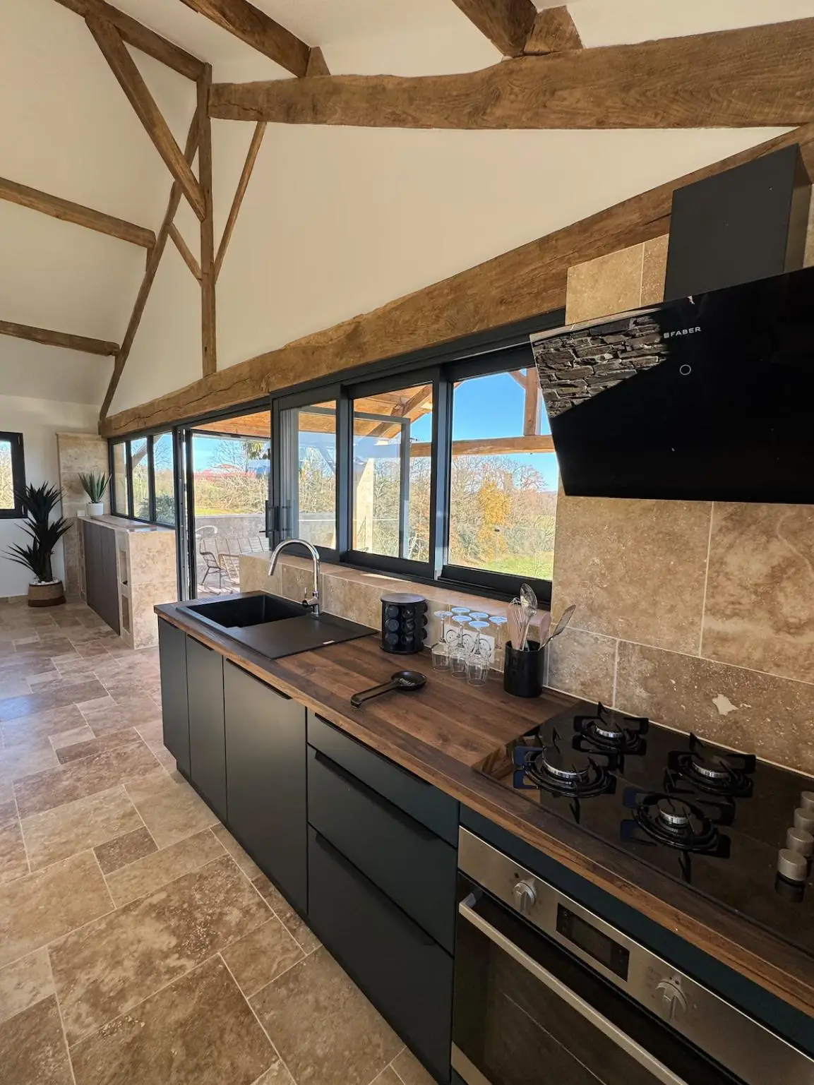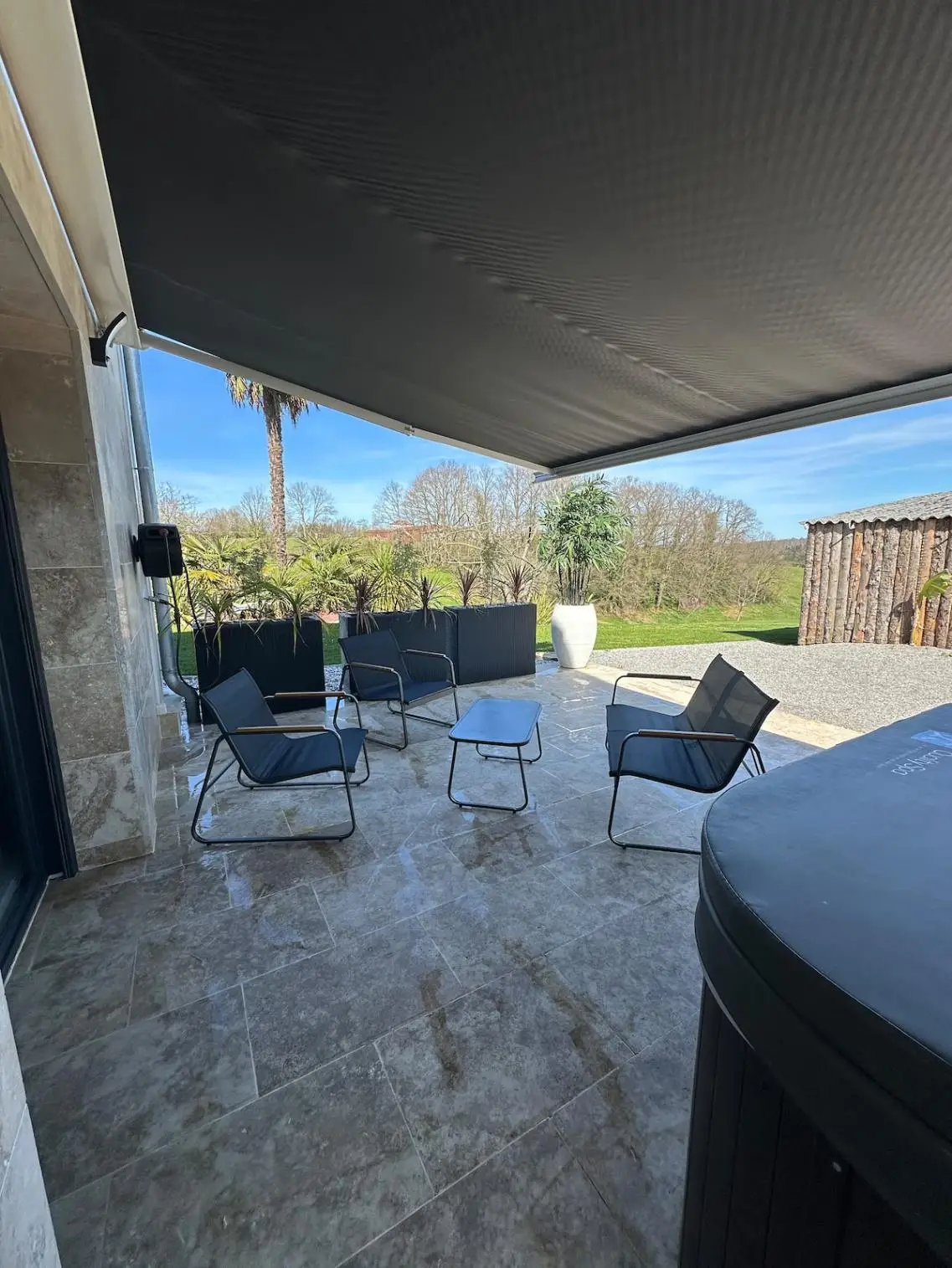 Cet espace convivial s'étend harmonieusement vers l'extérieur grâce à une grande terrasse couverte, véritable belvédère sur les Pyrénées. Ce lieu privilégié vous permettra de savourer vos petits-déjeuners dans la fraîcheur matinale ou de partager un verre entre amis en admirant les teintes flamboyantes du coucher de soleil sur les sommets pyrénéens.