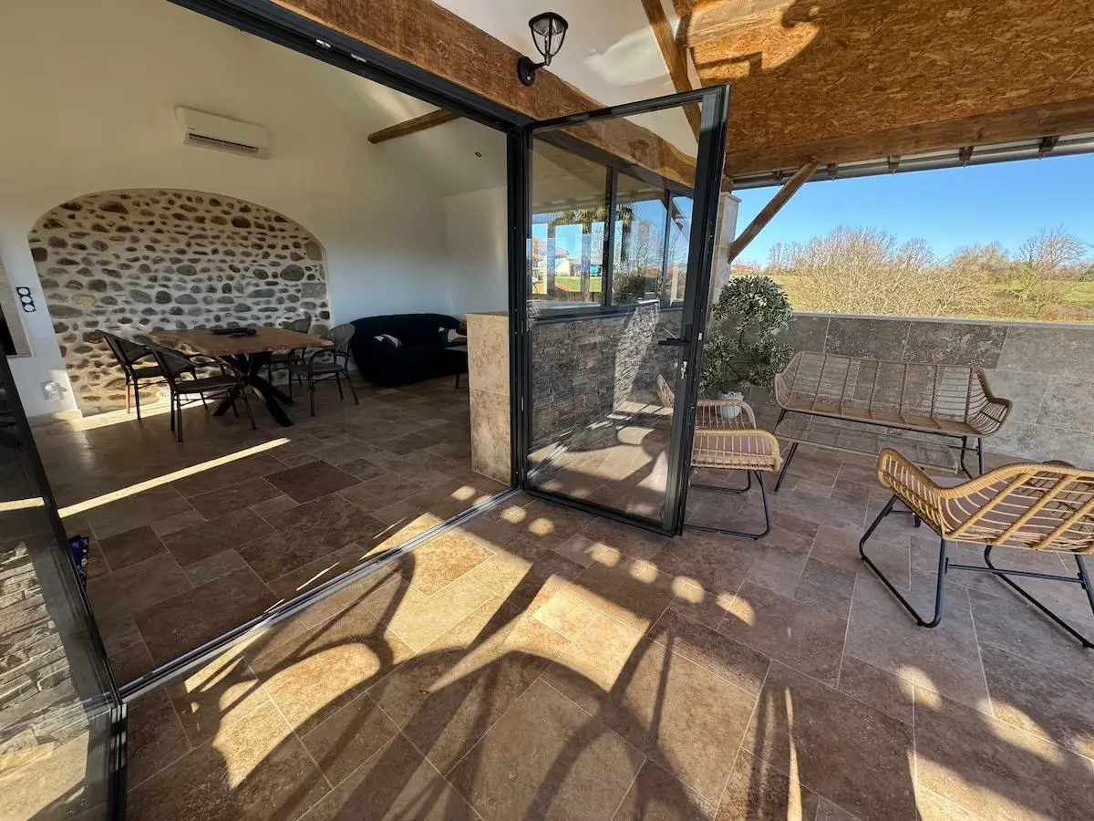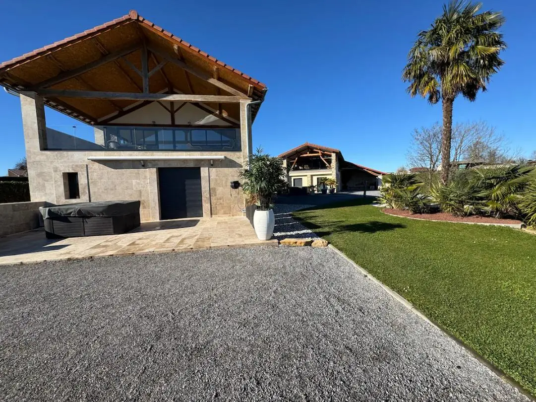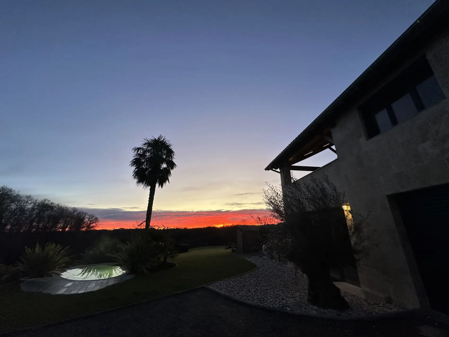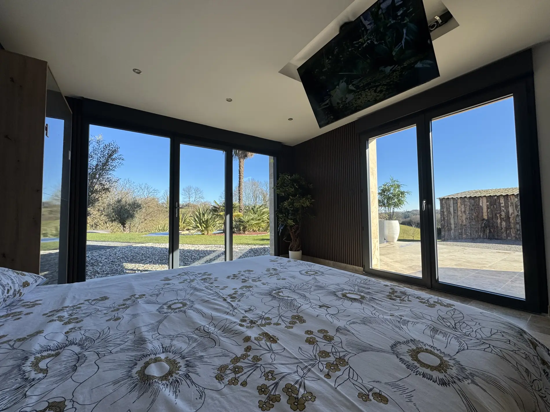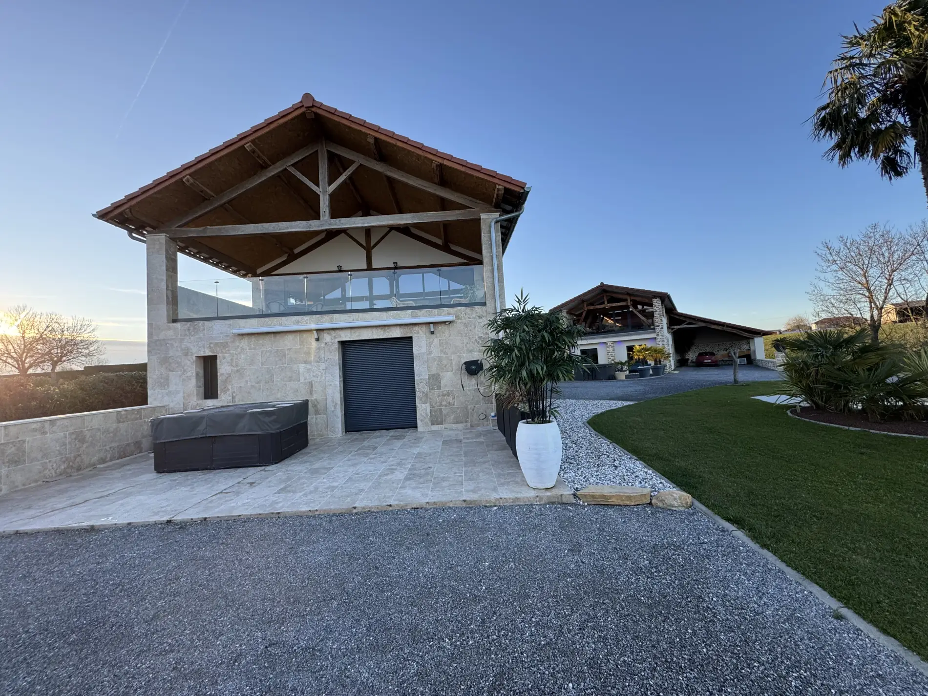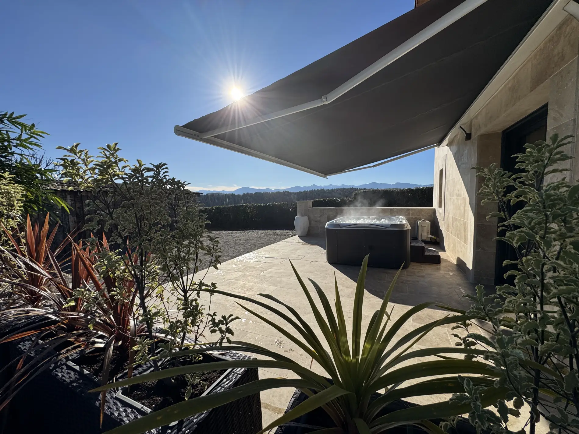 Cet espace convivial s'étend harmonieusement vers l'extérieur grâce à une grande terrasse couverte, véritable belvédère sur les Pyrénées. Ce lieu privilégié vous permettra de savourer vos petits-déjeuners dans la fraîcheur matinale ou de partager un verre entre amis en admirant les teintes flamboyantes du coucher de soleil sur les sommets pyrénéens.