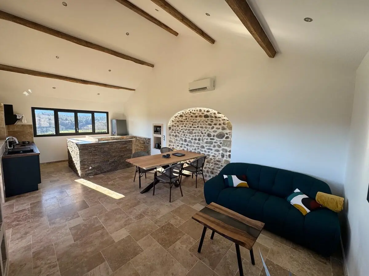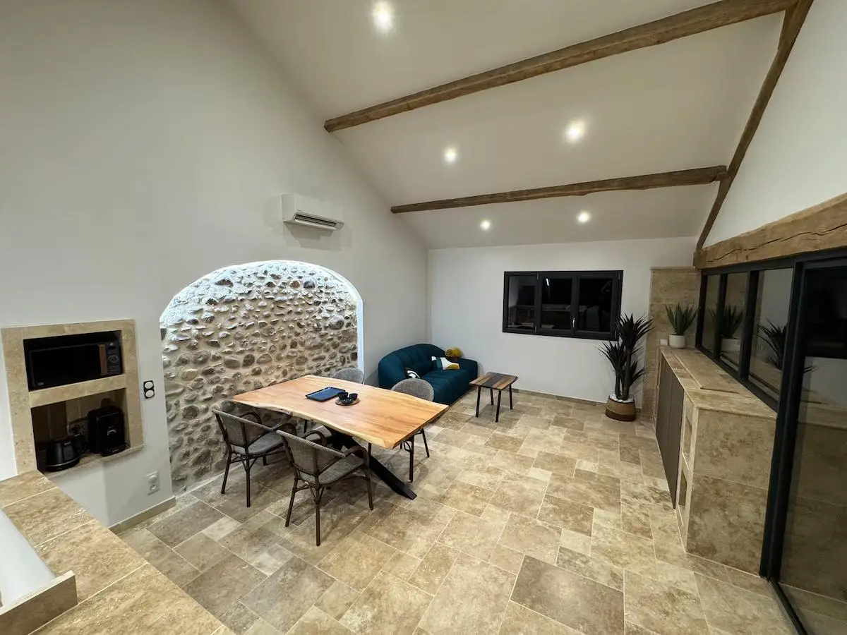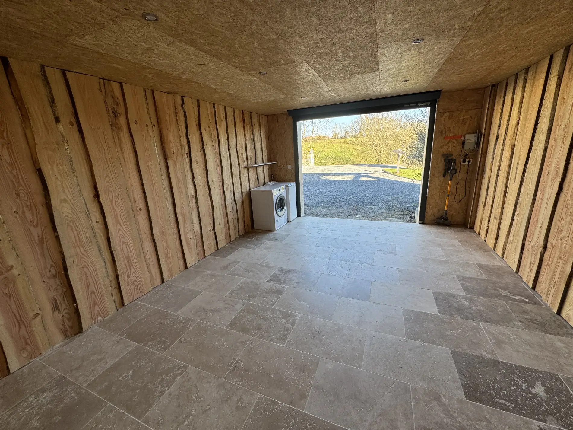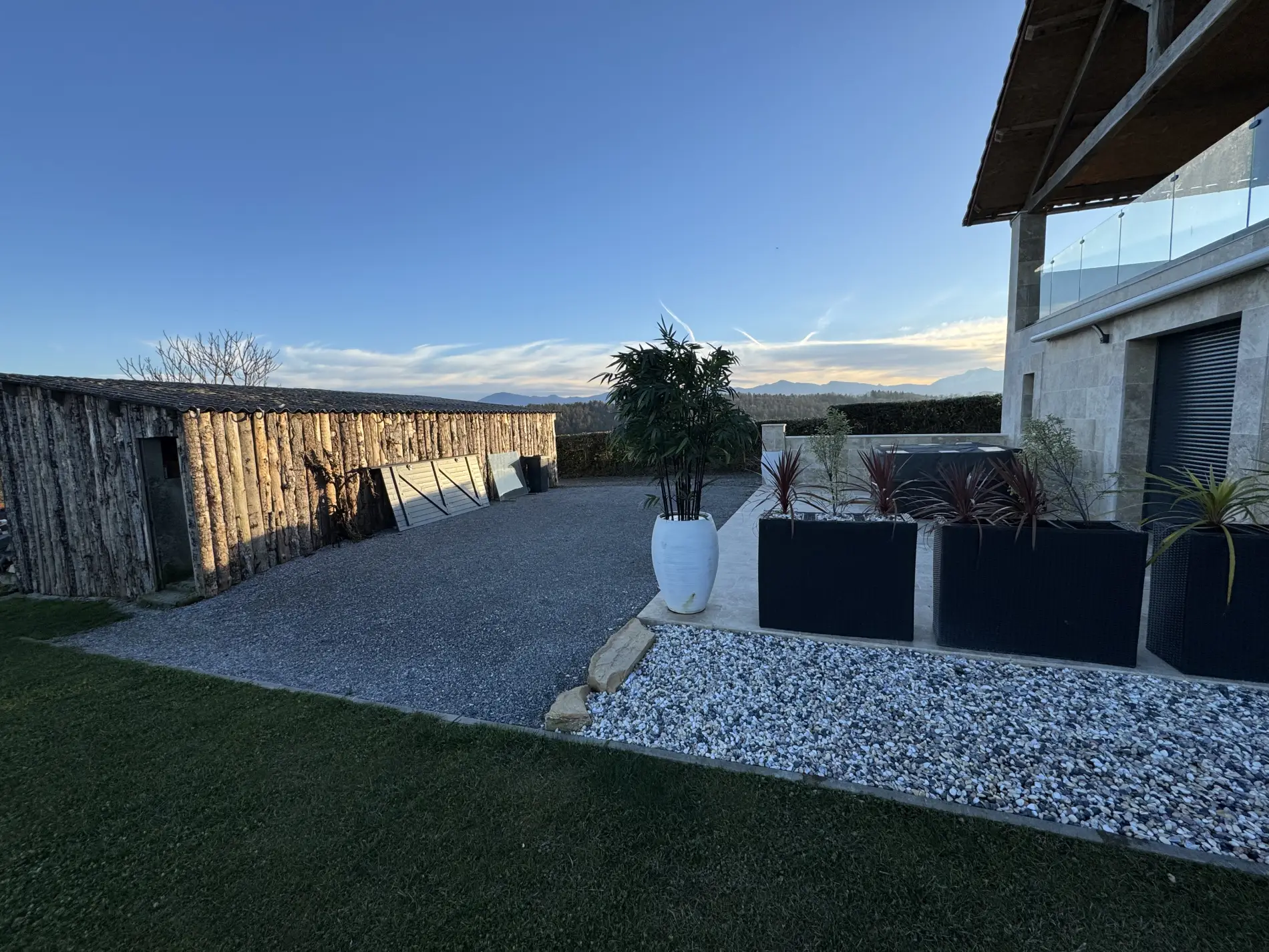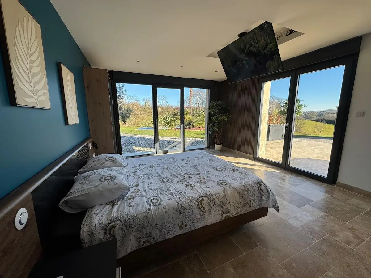 Cet espace convivial s'étend harmonieusement vers l'extérieur grâce à une grande terrasse couverte, véritable belvédère sur les Pyrénées. Ce lieu privilégié vous permettra de savourer vos petits-déjeuners dans la fraîcheur matinale ou de partager un verre entre amis en admirant les teintes flamboyantes du coucher de soleil sur les sommets pyrénéens.