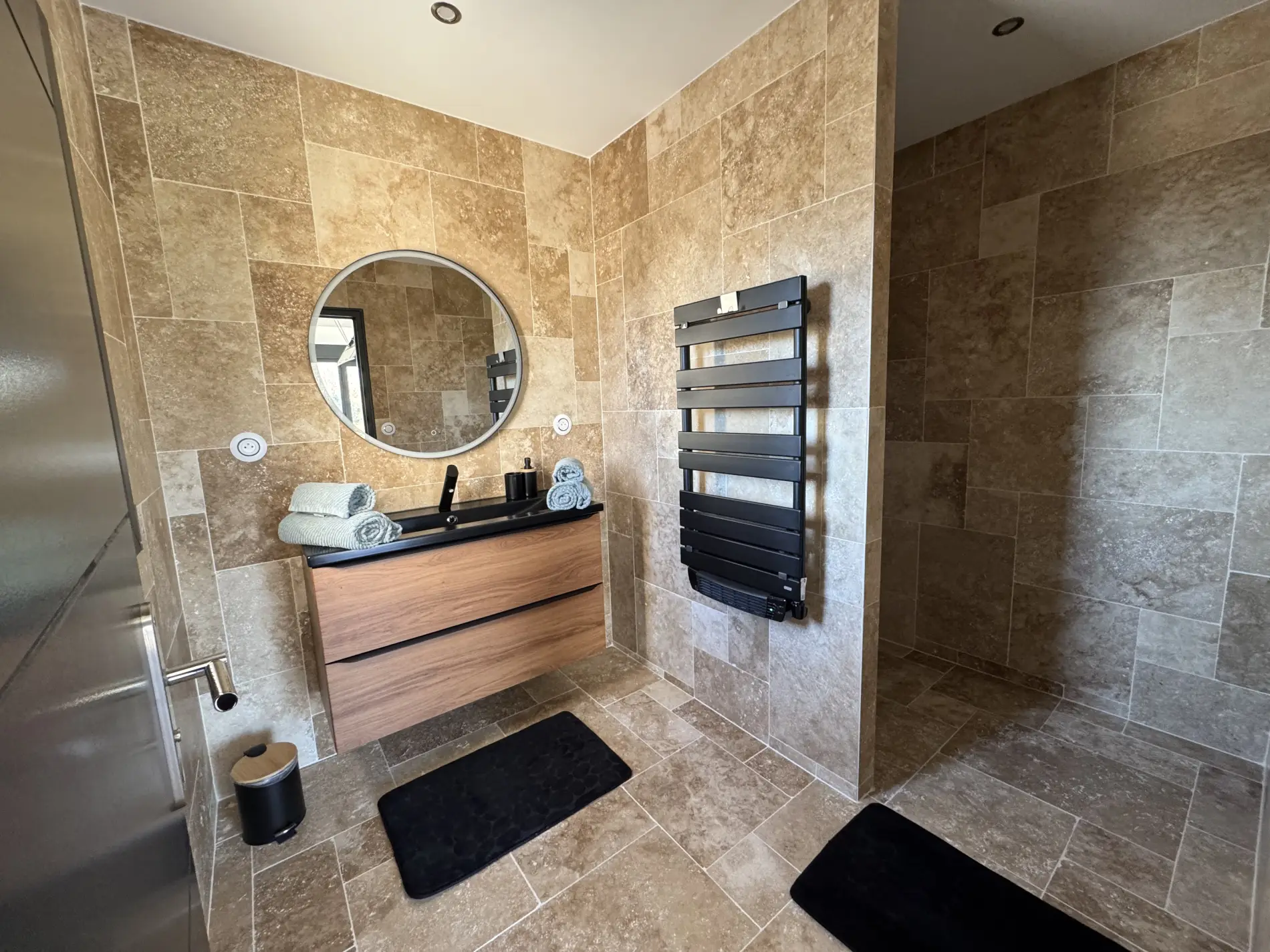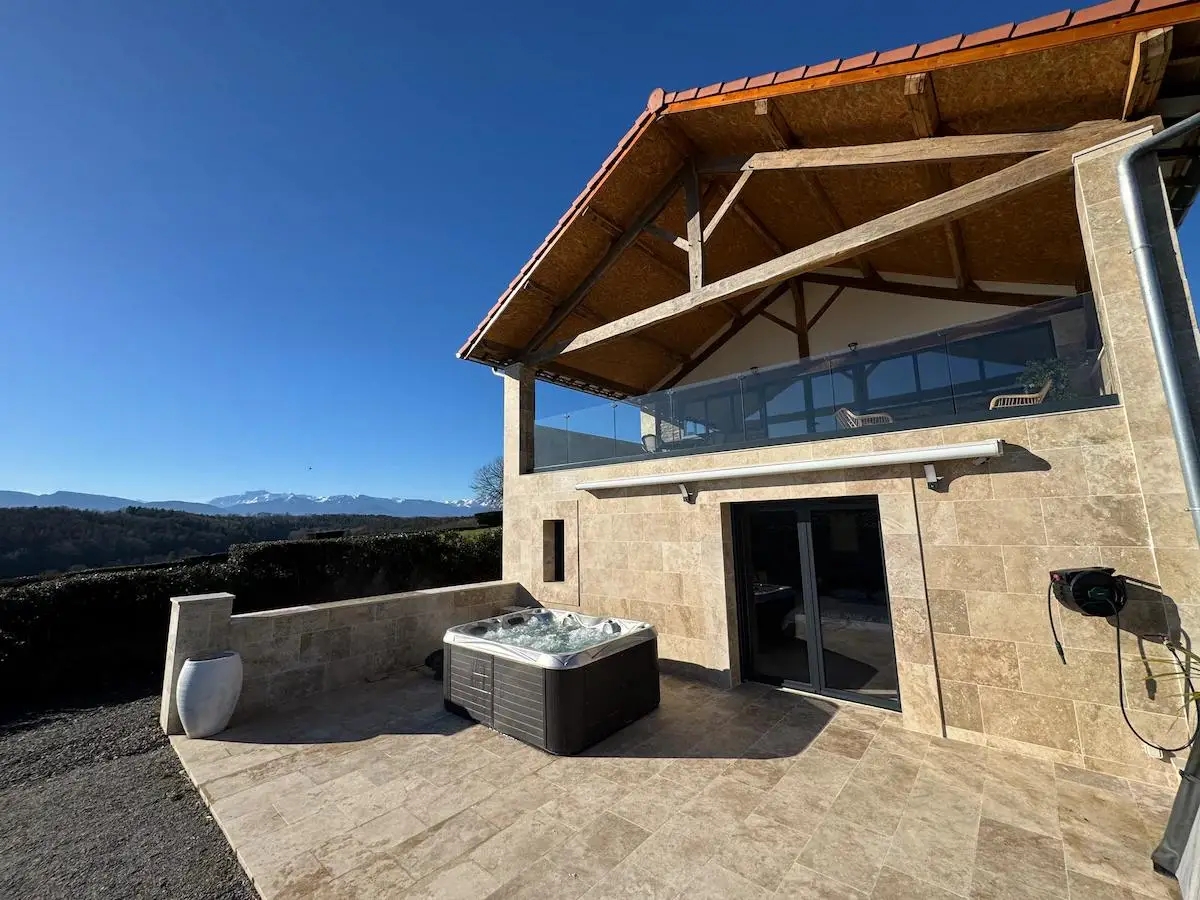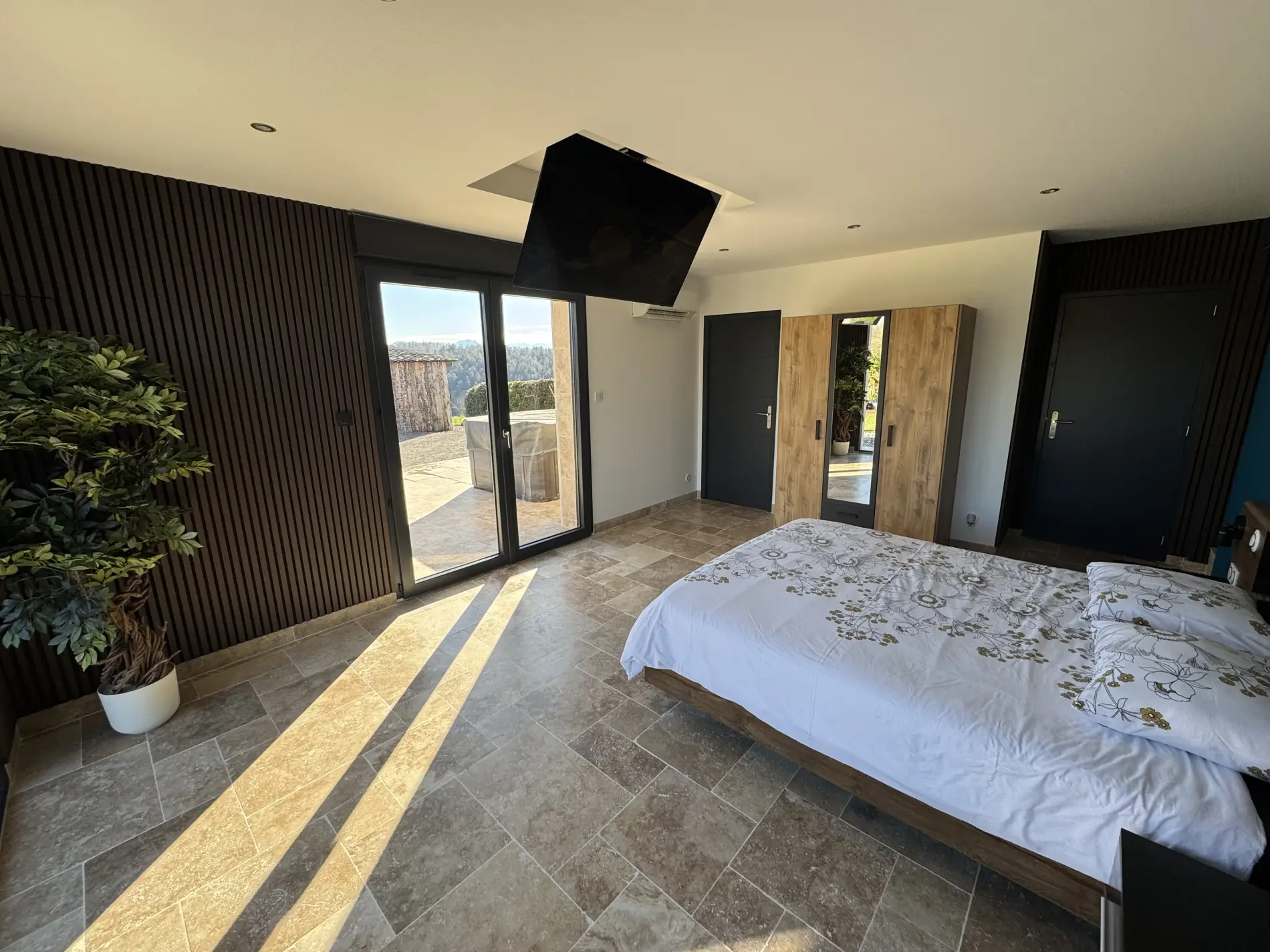 Pour vos moments de repos, une grande télévision est discrètement installée au plafond. Cette pièce s'ouvre directement sur une terrasse privée où vous attend un jacuzzi privatif, accessible en illimité et chauffé pour votre seul plaisir. Une salle de bain moderne et des WC complètent ce niveau.