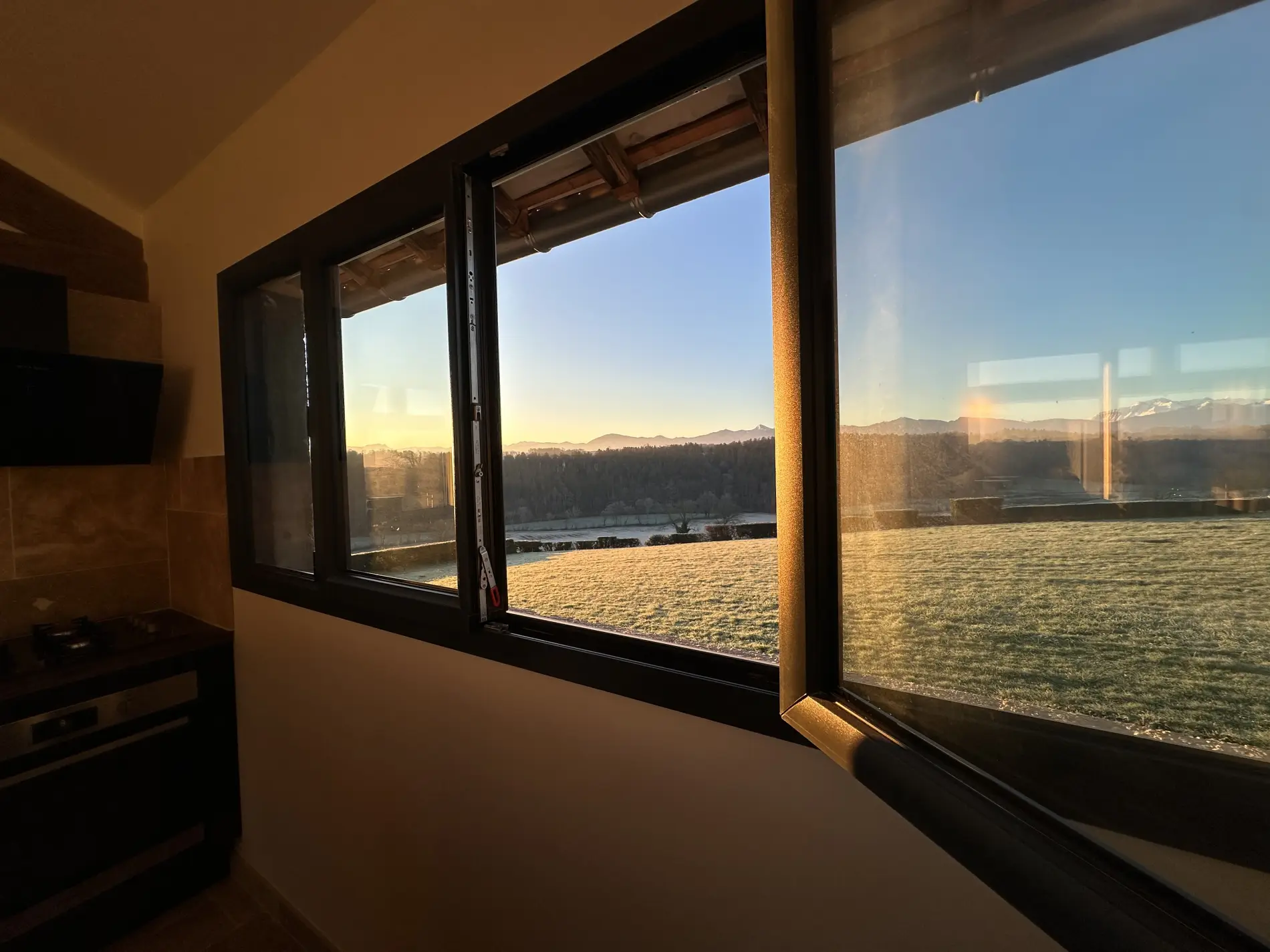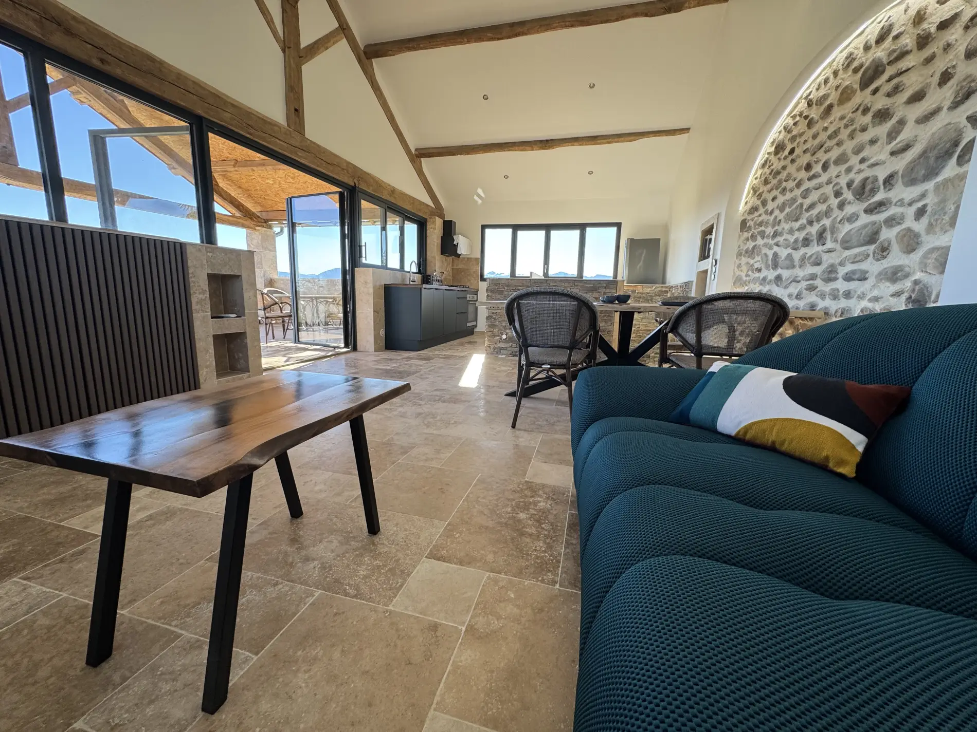 À l'étage, la pièce à vivre baigne dans une lumière naturelle abondante et offre un panorama spectaculaire sur les montagnes environnantes. Les grandes baies vitrées créent une sensation d'immersion totale dans ce paysage majestueux qui change au fil des heures et des saisons.